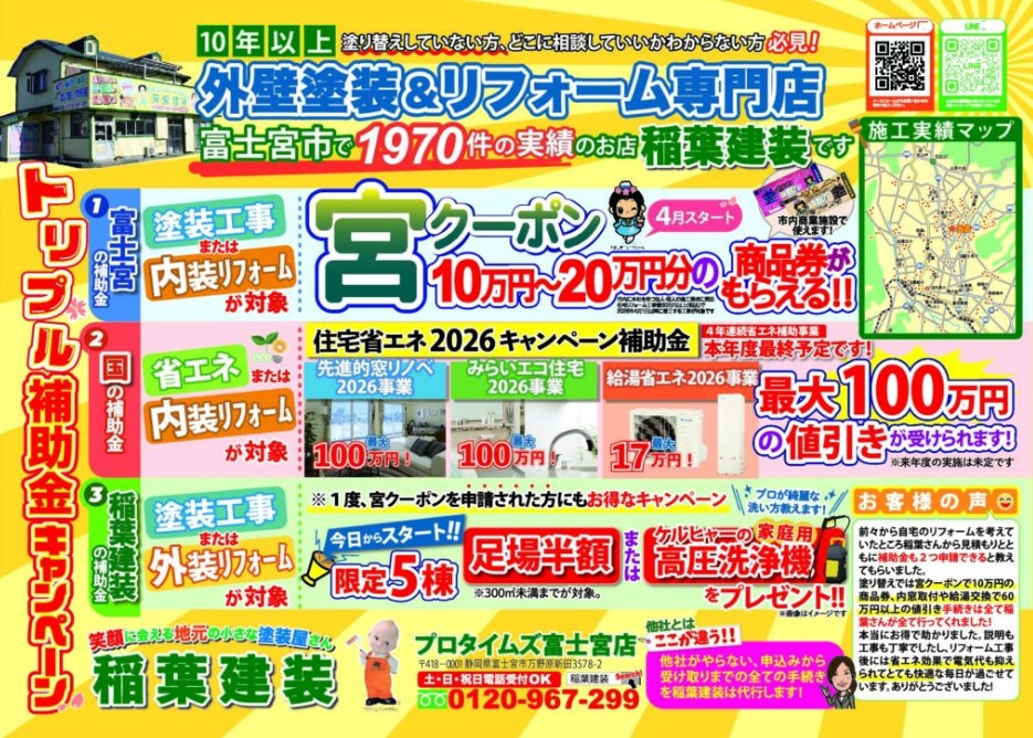 稲葉建装(プロタイムズ富士宮店)では、皆さまがお得に、そして高品質な塗装工事ができるよう全力でバックアップいたします。