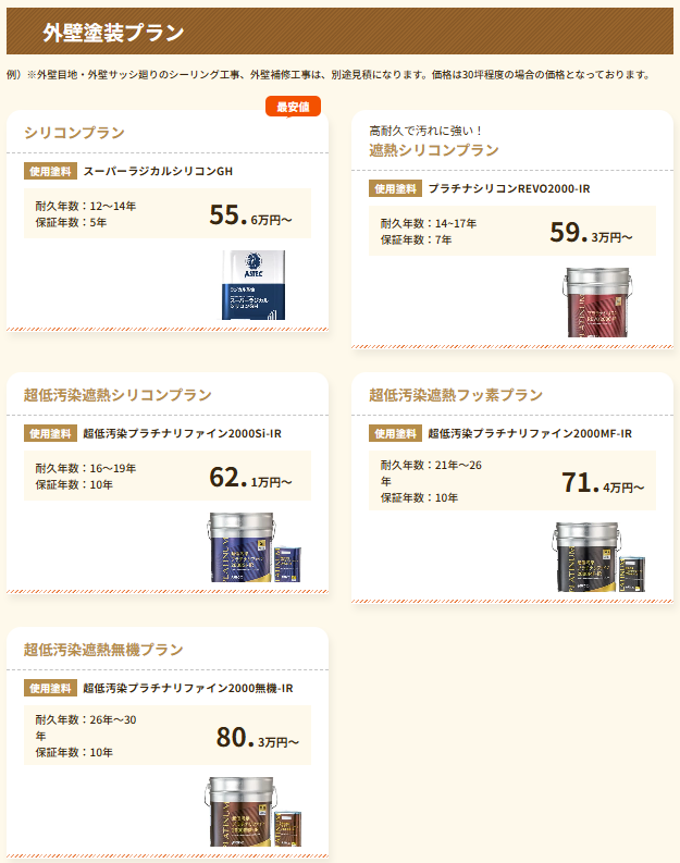 シリコン塗料からフッ素塗料、無機塗料まで、耐久年数や性能の異なる塗装プランをご用意しております。